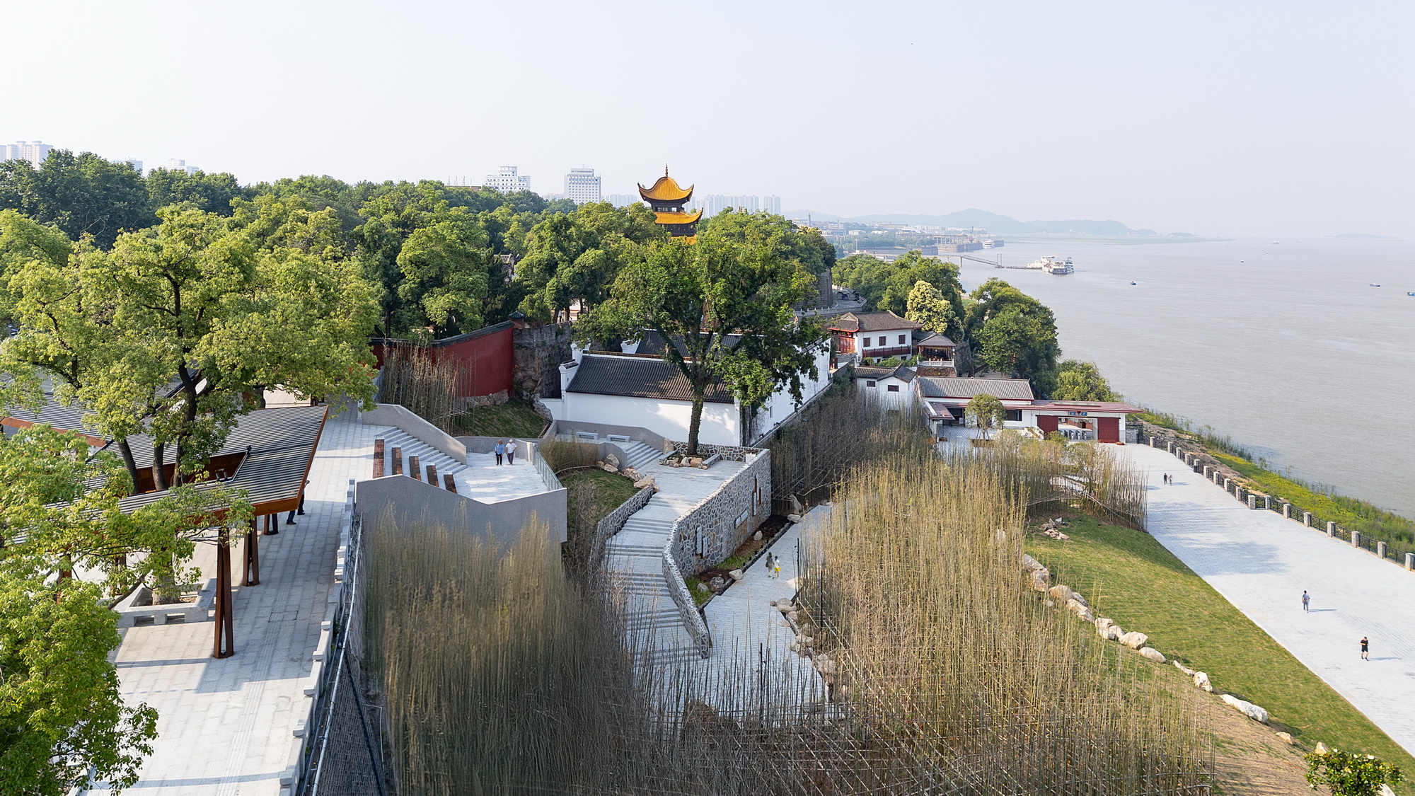 岳阳楼景区是一个南北狭长的封闭式公园,长期以来仅有南门对外开放,导致内部游览动线需走回头路,北区利用率低下,且北部停车场距离入口较远,节假日交通拥堵问题尤为突出,对文物安全也构成隐患,亟需增设北部出入口。景区北部湖岸原为棚户区,千禧年后因水灾完成拆迁,形成一片开阔坡地,并暴露出沿洞庭北路的一段古城墙。该区域紧邻海事局大楼及码头,随着这些空间退还给民用,如何将游人从高处的洞庭北路安全引导至高差17米的湖畔,同时满足文物保护要求、增添城市浪漫氛围,成为设计的核心挑战。