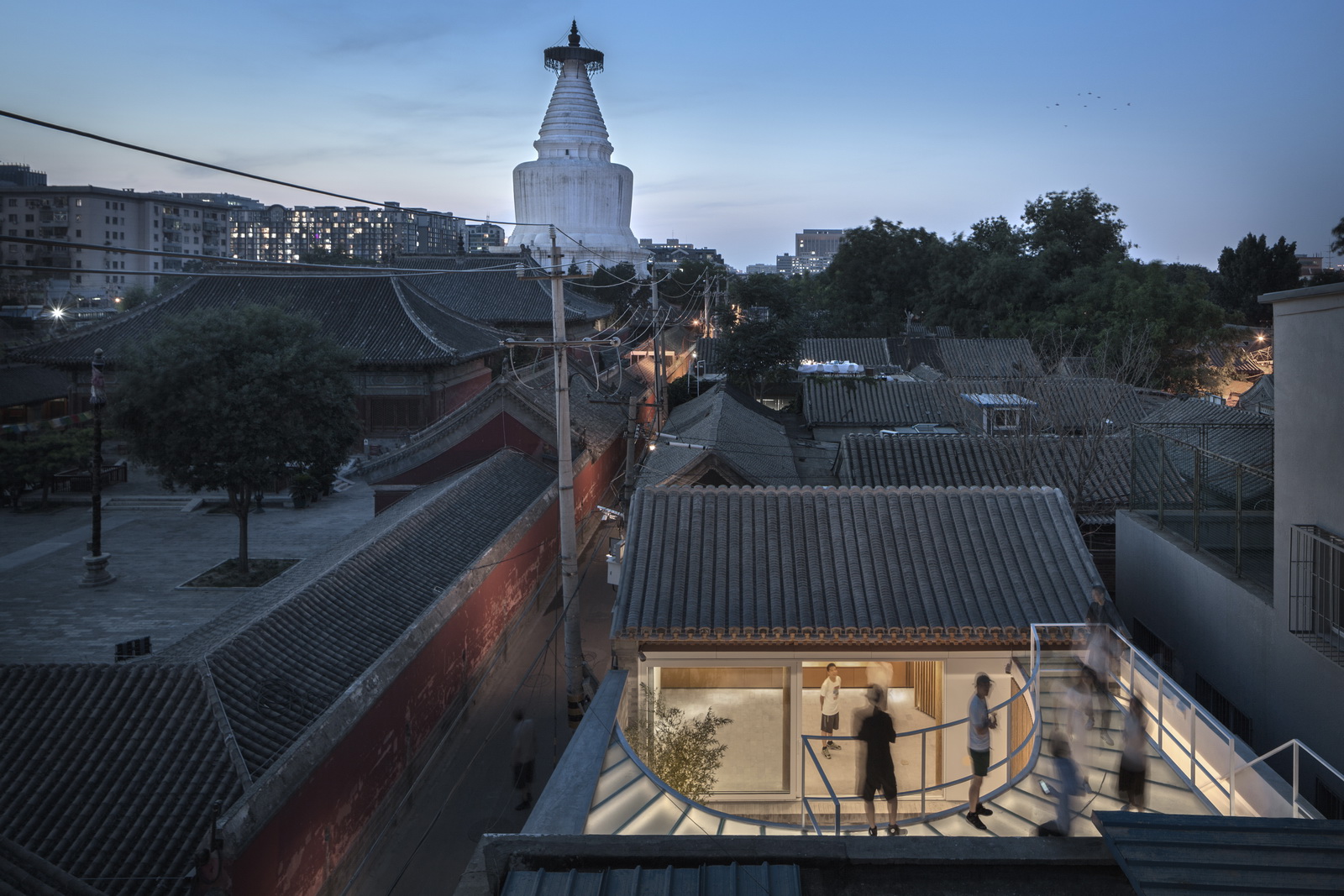 “二”的对偶是为了“合”。“二合”在这里有好几层含义。第一,它是场地的统合,通过屋与院二合一的空间演绎,证明了一个仅一百余平米占地的传统居住单位的确是一个尺度合宜的小宇宙,是城市在最小单元层面上的完美。第二,它也是院子和胡同环境的统合,通过院墙上、院门上半透的部分把白塔寺红墙溢到院内,同时也把这个做为白塔寺城市更新展厅的活力溢出到东夹道胡同。第三,它把壮观的白塔景观有机地统合进院子场景中。第四,这个邻近阜成门内大街的院子,也是通向白塔寺片区未来许许多多有趣的公共院落的门户,所以它是以一个公共“门厅”院对偶着其它离散的独立单元,是一栋住宅和一个片区的统合。